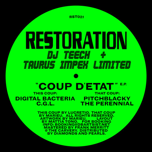Dj Teech and Taurus Impex Limited are the pseudonyms chosen by Marieu and Lucretio for their unconventional output, and already signed by Berceuse Heroique and Knick Knacks Yoda. “Coup d’etat” is a collection of 4 cutting edge tracks at the boundaries of Techno and House music.