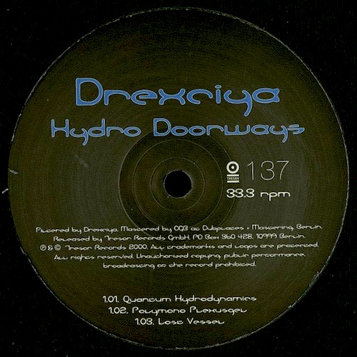 Electro, Techno … The “Hydro Doorways” EP complements the vinyl edition of the “Neptune’s Lair” album. The two central items in Drexicya’s oeuvre – “Neptune’s Lair” and “Harnessed the Storm” – were released on Tresor between 1999 and 2002 and represent the absolute highpoint of their self-made universe of electro-science.