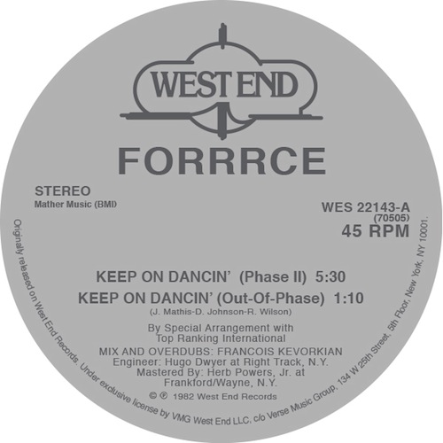 Another classic from the West End archives! Forrrce’s “Keep On Dancin” from 1982 was a huge record across the board from Bronx block parties to the Paradise Garage in NYC and DJ Harvey’s “Moist” nights in London town, it’s popularity was bolstered by a fierce Francois K dub mix on the B-side that stripped the record right back to it’s most basic elements with a healthy dose of reverb assisted psychedelia thrown in for good measure! This killer cowbell led Boogie jam has always been a big hit with Disco freaks and continues to sound fresh some 30+ years later even making it’s way into veteran UK DJ and music historian Sean P’s “100 Boogie Essentials 1980-1984” list. High praise indeed!
