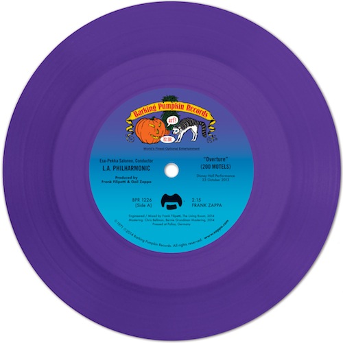 In October 2013, the Los Angeles Philharmonic Orchestra, under the baton of conductor Essa-Pekka Salonen, recorded the music of composer Frank Zappa which he had originally scored for his cult-classic movie “200 Motels.” This limited-edition, purple-colored 7” single contains the opening piece from the concert, “Overture” (from 200 Motels) and another gem from the Zappa canon on the B-side; the previously unreleased recording of “What’s the Name of Your Group?” from the original score performed in 1971 by Zappa with the Royal Philharmonic.