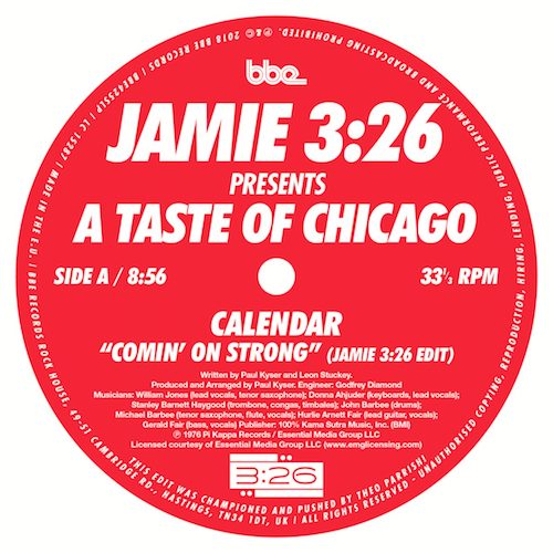 Announcing his forthcoming BBE album ‘Taste of Chicago’, edit kingpin and DJ par excellence Jamie 3:26 drops a 12” comprising two of his most highly prized cuts. A1 Calendar – Comin’ On Strong (Jamie 3:26 Edit) B1 Braxton Holmes presents CabriniGreens and Cornbread – Stomps & Shouts (Jamie 3:26 Edit)