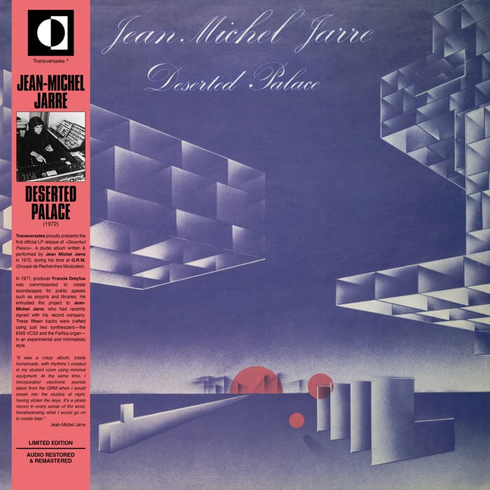 Experimental … Transversales Disques proudly presents the first official LP reissue of “Deserted Palace”, studio album written & performed by Jean Michel Jarre in 1972, during his work experience at G.R.M.. These fifteen tracks are made with only two synthesizers (EMS VCS3 & Farfisa organ) in an experimental and very minimal style.