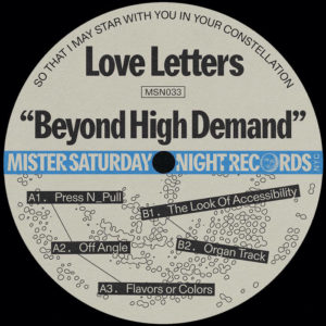Nowadays family member Love Letters delivers the next record on Mister Saturday Night records. The Vermont native turned New Yorker delivers a beautiful 5 track release that meanders effortlessly from peak time banger to delicate experimental passages to off kilter poly rhythms.