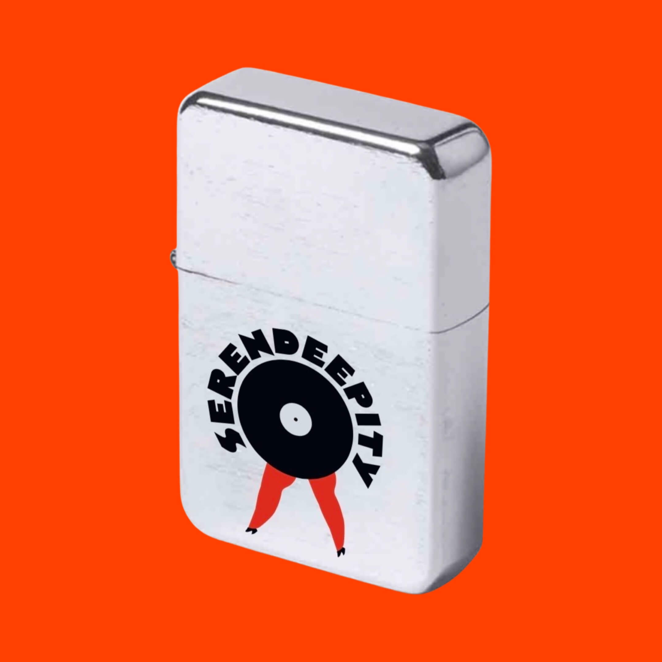 Silver Zippo lighter with Black/Red Serendeepity logo print.