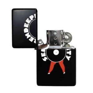 Silver Zippo lighter with Black/Red Serendeepity logo print.