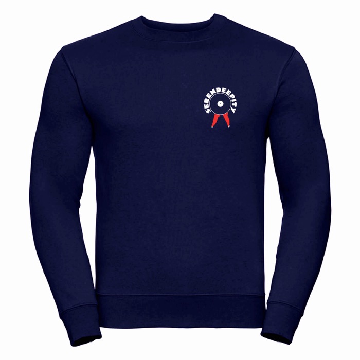 French Navy Blue sweatshirt with White/Red Serendeepity logo on front, printed on high quality Russell Athletics fleece.