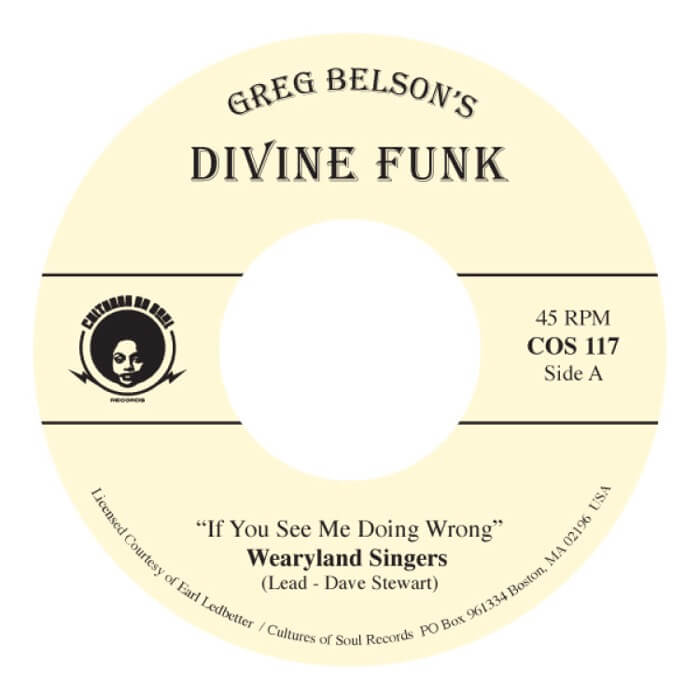 Gospel … Following on from the success of ‘Greg Belson’s Divine Disco’ series Greg Belson and Cultures of Soul team up again to explore the world of Gospel Funk. Second in the Devine Funk 7 inch series, The Wearyland Singers “If You See Me Doing Wrong” with “Nobody But Jesus” by The Chariettes Gospel Singers on the B-Side.